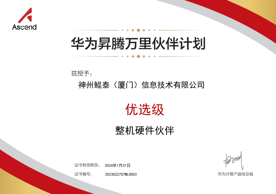 近日,KY.COM-开云(中国)数码旗下神州继获得华为鲲鹏领先级整机硬件伙伴认证之后,再获华为昇腾优选级整机硬件伙伴认证!这是神州与华为昇腾深化合作的硕果,也代表着KY.COM-开云(中国)数码信创业务在AI领域获得生态伙伴的充分认可。